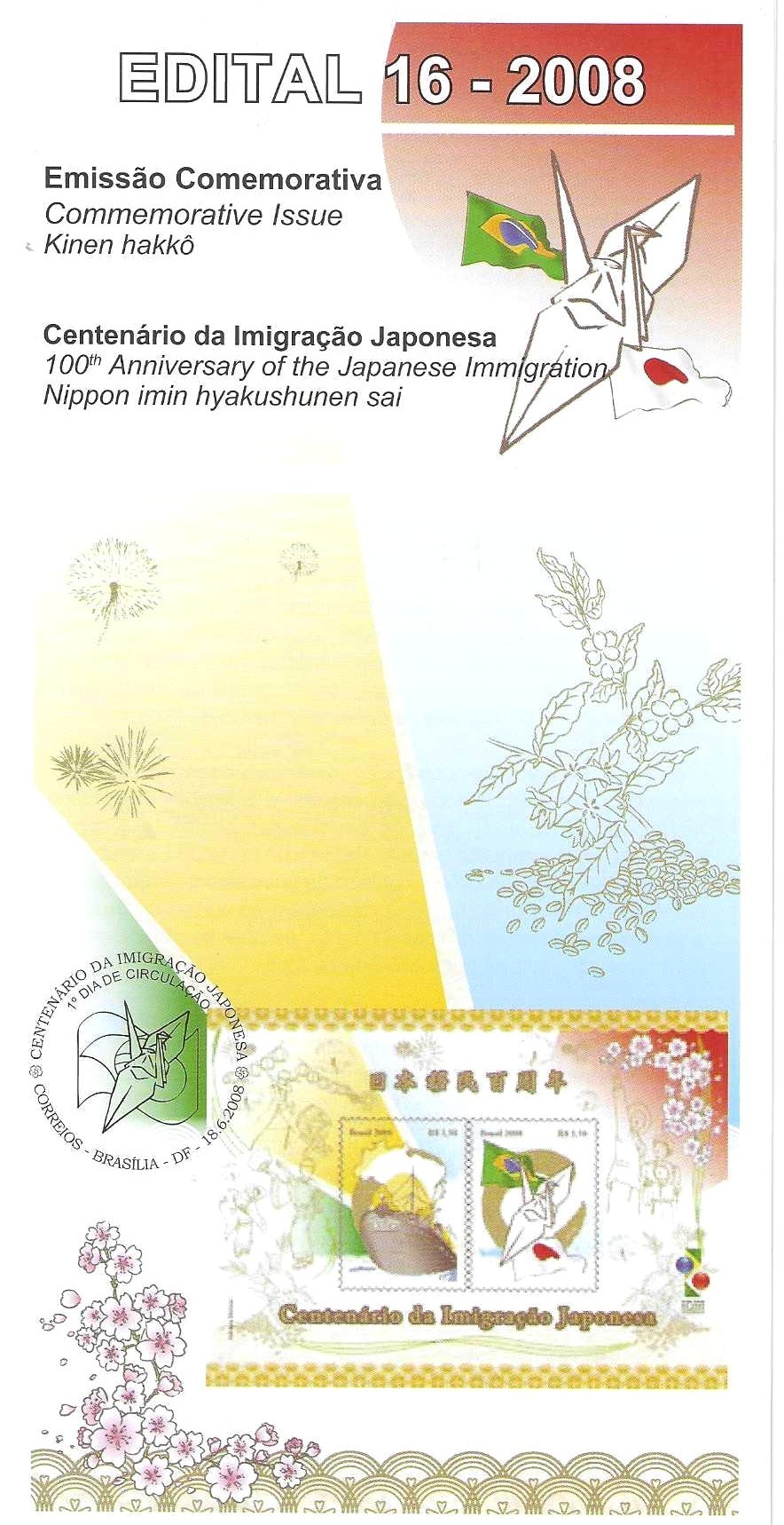 Br-Edital, 16/2008 (Mint). Emissão Comemorativa: Centenário de Imigração Japonesa. Locais de Lançamento: Belém/PA, Brasília/DF, Campo Grande/MS, Curitiba/PR.