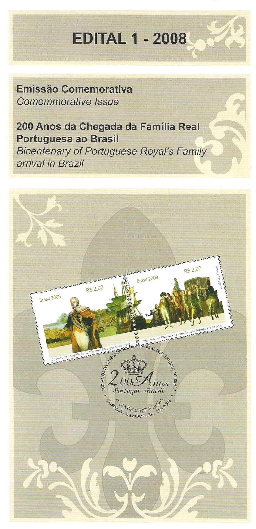 Home Filatelia Selos Países Temas Brasil Datas especiais Br-Edital, 01/2008 (Mint). Emissão Comemorativa: 200 Anos da Chegada da Família Real Portuguesa ao Brasil. Local de Lançamento: Salvador/BA, Rio de Janeiro/RJ, Lisboa/Portugal.