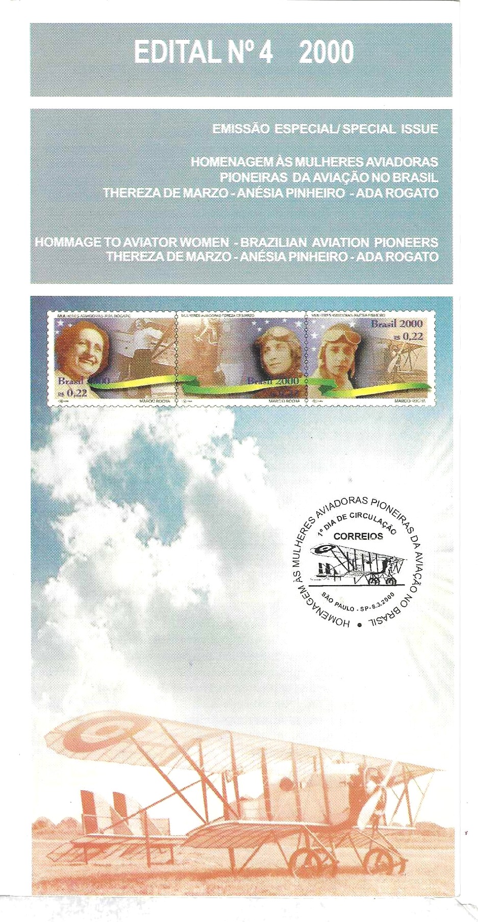 Br-Edital, 04/2000 (Mint). Emissão Especial: Homenagem as Mulheres Aviadoras, Pioneiras na Aviação no Brasil (Thereza de Marzo, Anésia Pinheiro e Ada Rogato). Local de lançamento ECT: São Paul/SP.