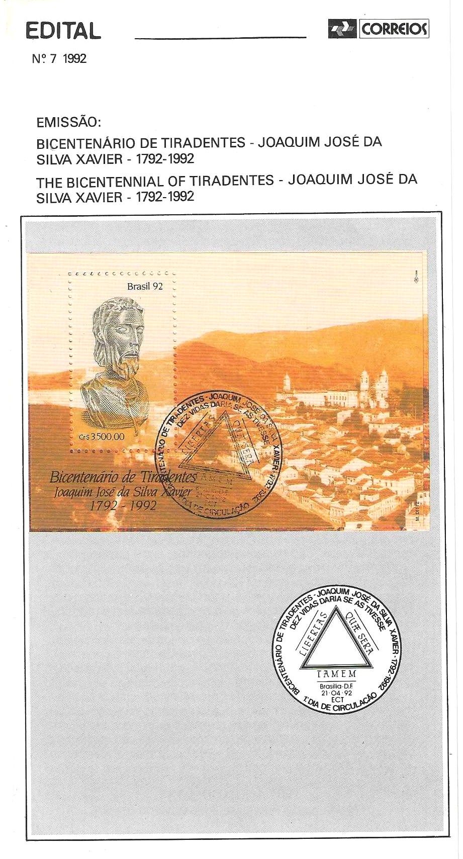 Br-Edital, 07/1992. (Mint). Emissão: Bicentenário da Execução de Tiradentes, Joaquim José da Silva Xavier (1748-1792). Brasília/DF. Bloco original colado, D-91 (RHM).