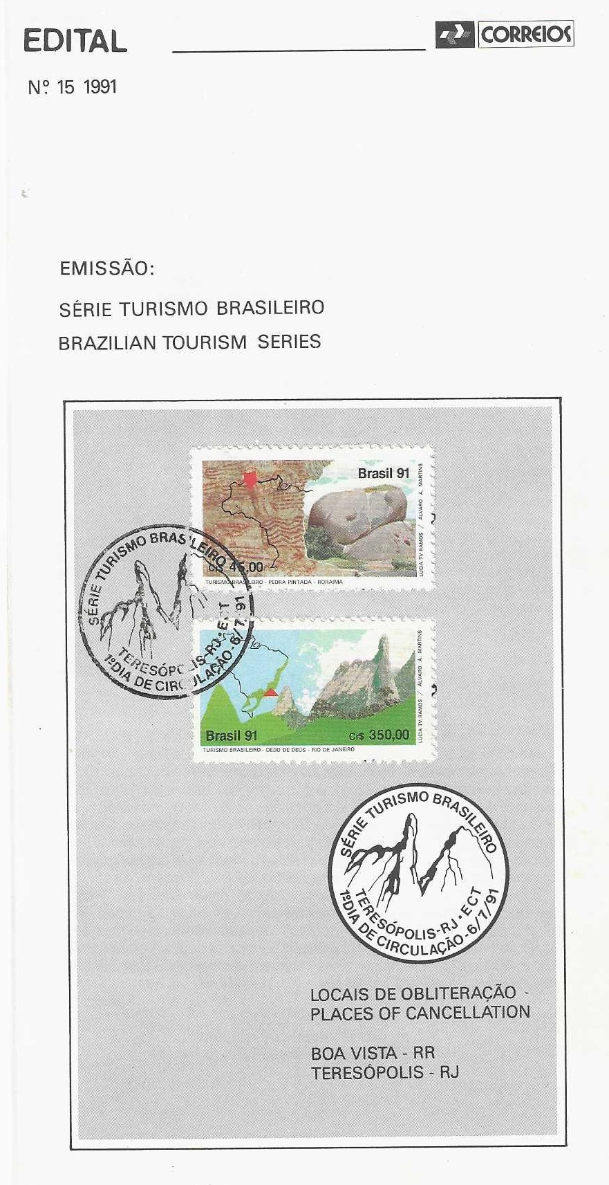 Br-Edital, 15/1991. (Mint). Emissão: Turismo Brasileiro – Pedra Pintada/Roraima e Dedo de Deus – Rio de Janeiro. Carimbo do 1º dia, Teresópolis/RJ. 02 (dois) selos originais colados C-1742/43 (RHM), (Mint).