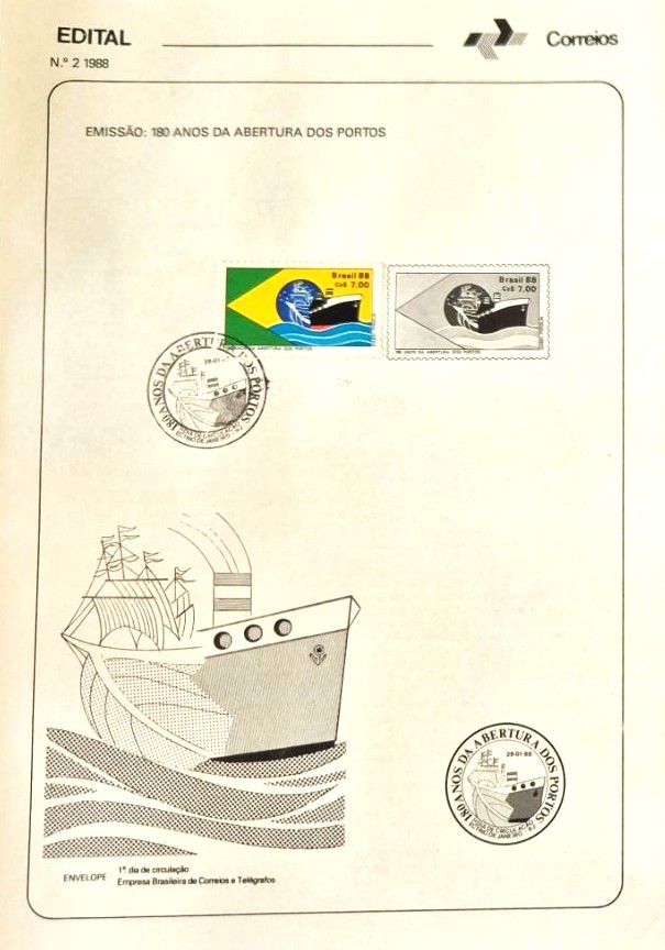Home Filatelia Selos Países Temas Brasil Navegação Br-Edital, 2/1988. (EPD). Emissão: 180 Abertura dos Portos (Navio Bandeira). Carimbo do 1º dia, Rio de Janeiro/RJ. C/Selo original, C-1577, (RHM) (Mint).