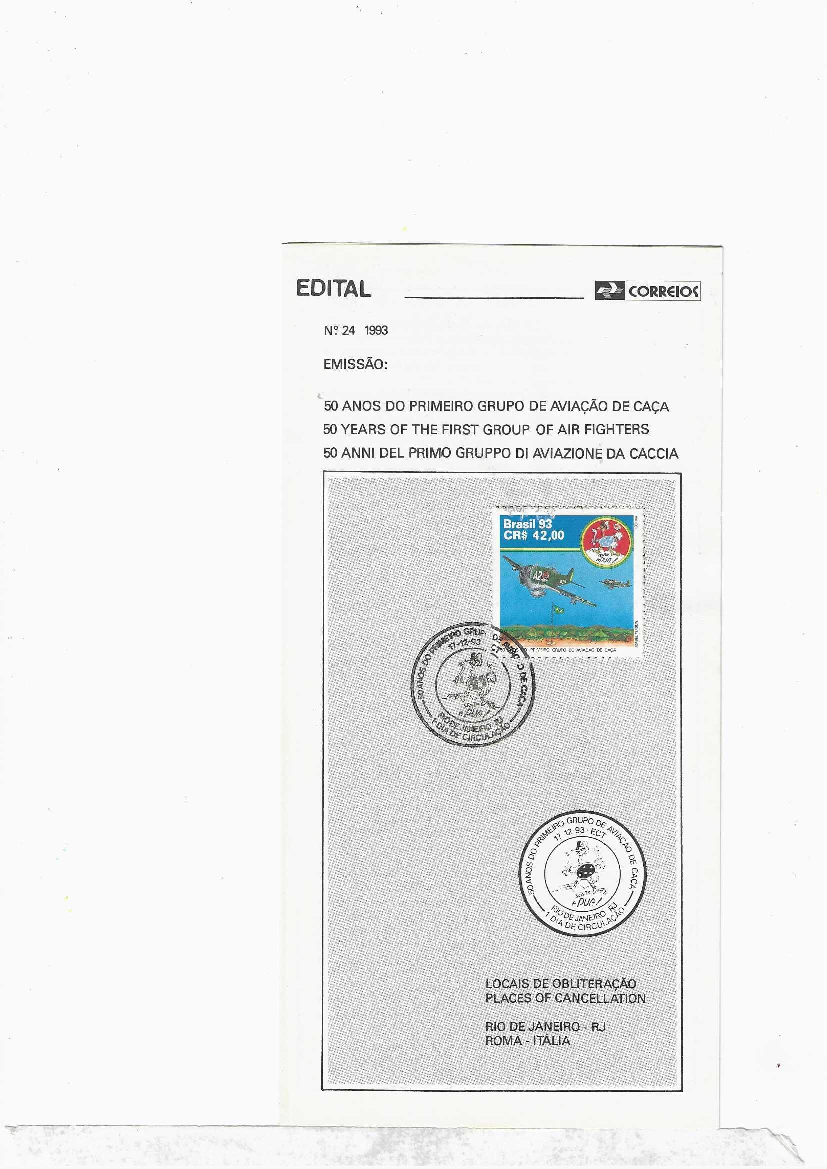 Br-Edital, 24/1993. (Mint). Emissão: 50 Anos do Primeiro Grupo de Aviação de Caça. Carimbo do 1º dia, Rio de Janeiro/RJ e Roma/Itália. 01 (um) selo original colado, 1880 (RHM), (Mint).