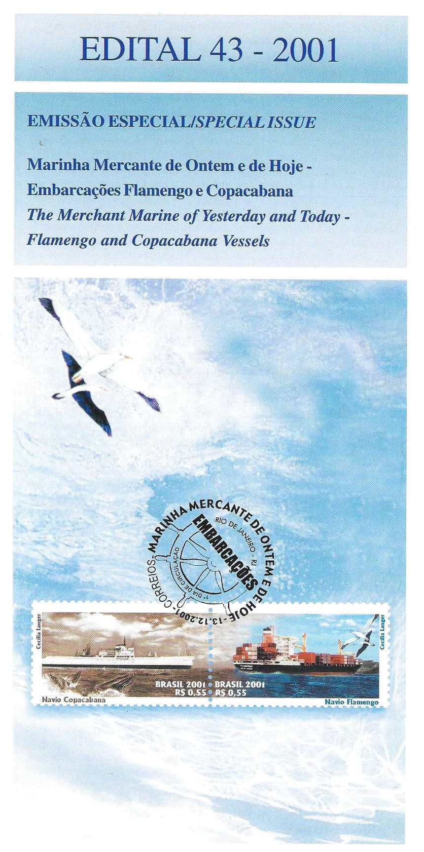Home Filatelia Selos Países Temas Brasil Datas especiais Br-Edital, 43/2001 (Mint). Emissão Especial: Marinha Mercante Ontem e Hoje, Embarcações Flamengo e Copacabana. Local de lançamento ECT: Rio de Janeiro/RJ.