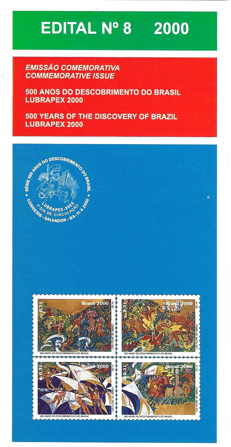 Br-Edital, 04/2000 (Mint). Emissão comemorativa: 500 Anos do Descobrimento do Brasil, Lubrapex 2000. Local de lançamento ECT: Salvador/BA.
