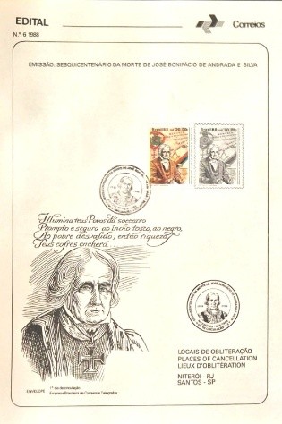 Br-Edital, 6/1988. (EPD). Emissão: 150 Anos da Morte de José Bonifácio de Andrade e Silva (1763-1838). Carimbo do 1º dia, Niterói/RJ. 1 (um) Selo C-1582, (RHM) (Mint).