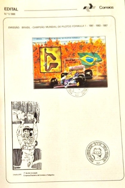 Br-Edital, 5/1988. (EPD). Emissão: Brasil - Campeão Mundial Fórmula 1, 1981/83/87, Nelsom Piquet S. Maior. Carimbo do 1º dia, Rio de Janeiro/RJ. 01 (um) Bloco D-75, (RHM) (Mint).