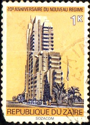 COD Selo, 1975, (República Democrática do Congo – Zaire/África), (U), Yt:CD 871. The 10th Anniversary of "New Regime". Sozacom apartment building, vertical.