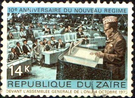 COD Selo, 1975, (República Democrática do Congo – Zaire/África), (U), Yt:CD 870. The 10th Anniversary of "New Regime". President Mobutu addressing UN Gen. Assembly, Oct. 1974.